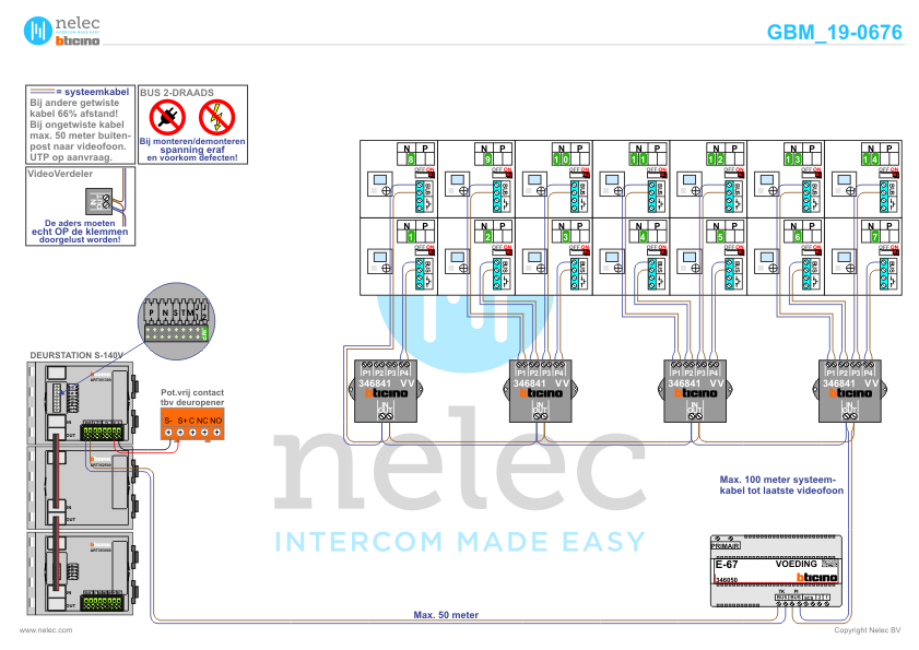 De Nelec installatiewijzer voor de BTicino VV Videoverdeler voor vier videofoons of om vier stijgers door te lussen.